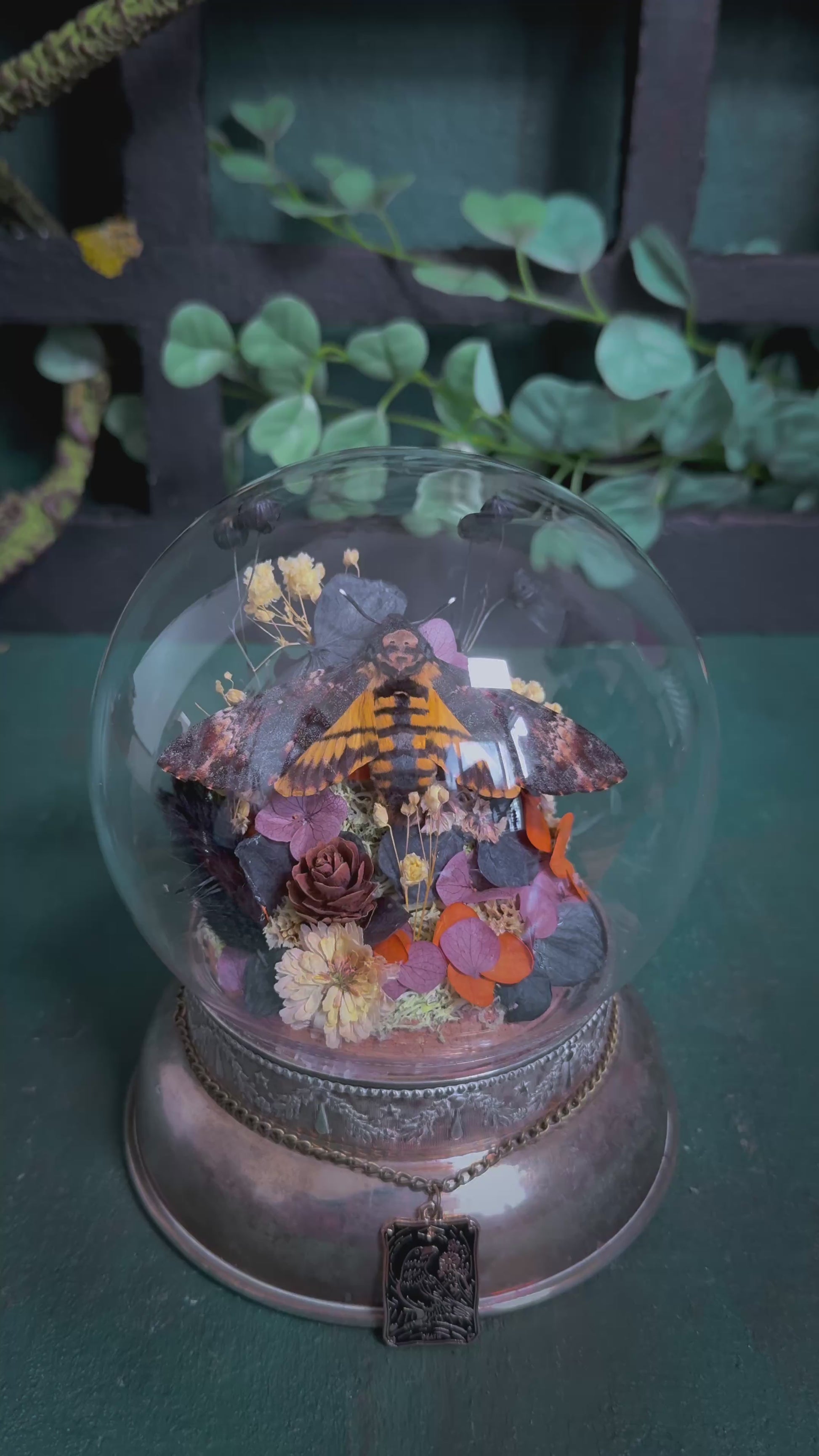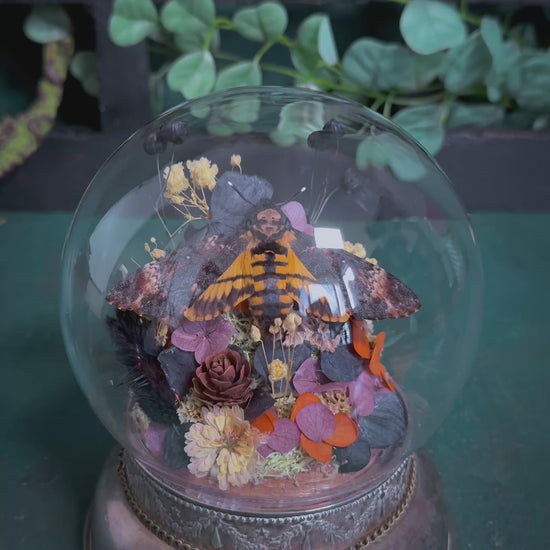 A mounted Acherontia atropos/Deathshead Hawkmoth moth pinned by us. Mounted in a round dome with a thrifted antique metal gold base, wrapped with bronze chain and a death tarot card charm. Internally decorated with real preserved moss and preserved florals creating a stunning natural earthy display that contrasts the moth and gives a full 360 display.