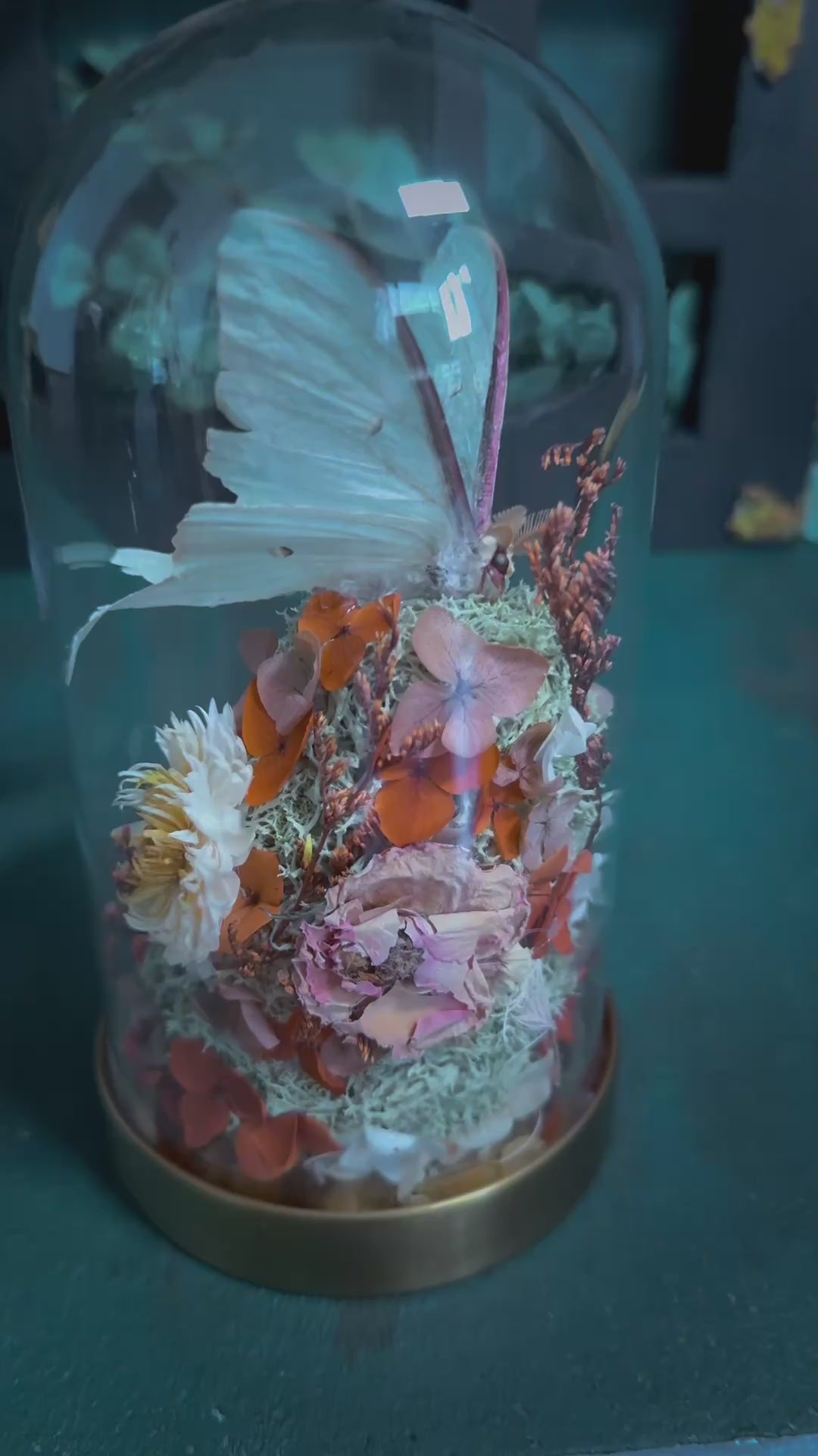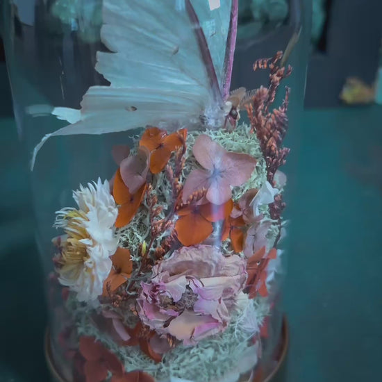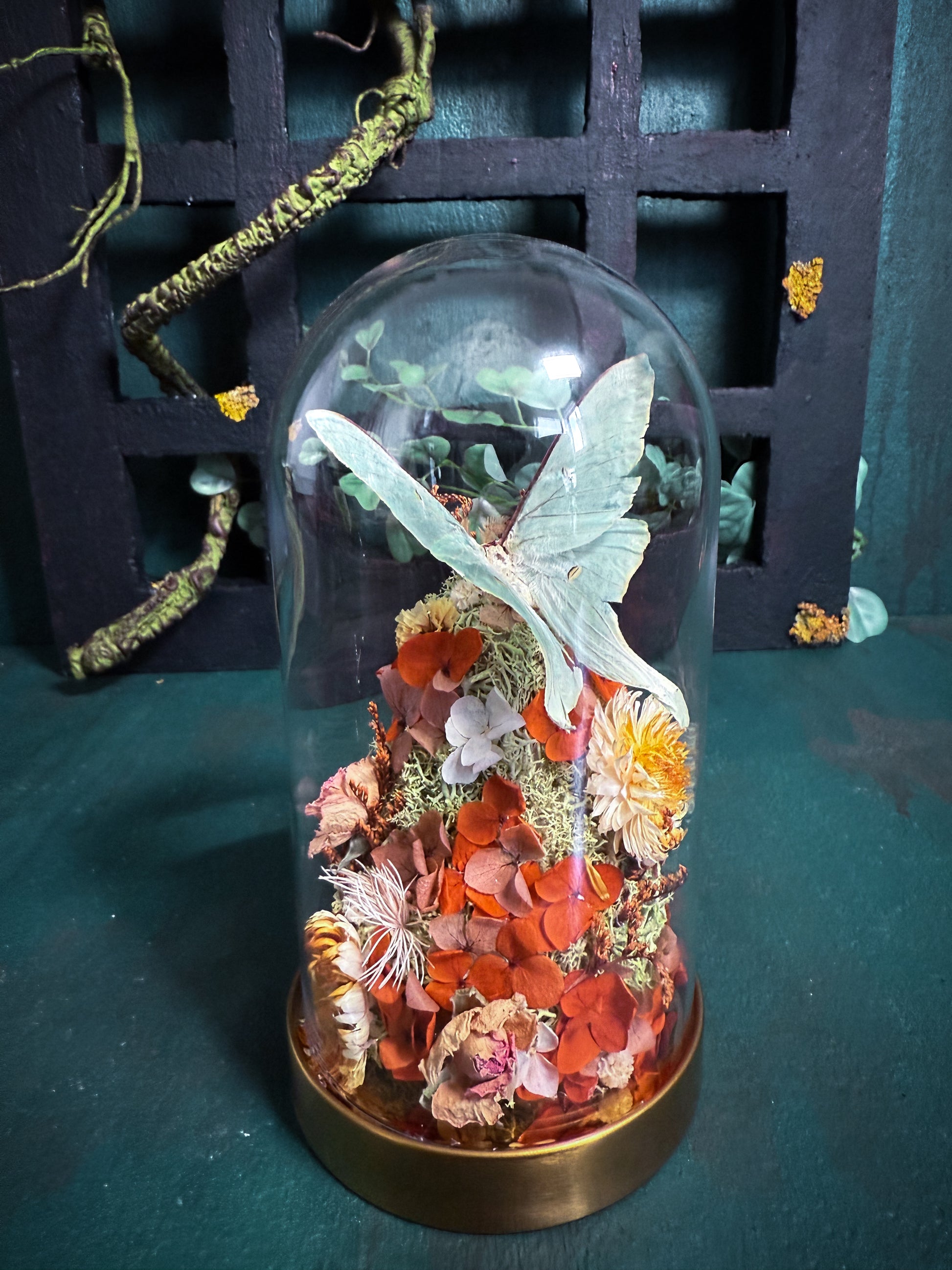 A mounted Actias Luna/Luna moth pinned by us. Mounted in a tall dome with a metal gold base, internally decorated with real preserved moss, preserved florals and crystals creating a stunning natural earthy display that contrasts the moth and gives a full 360 display.