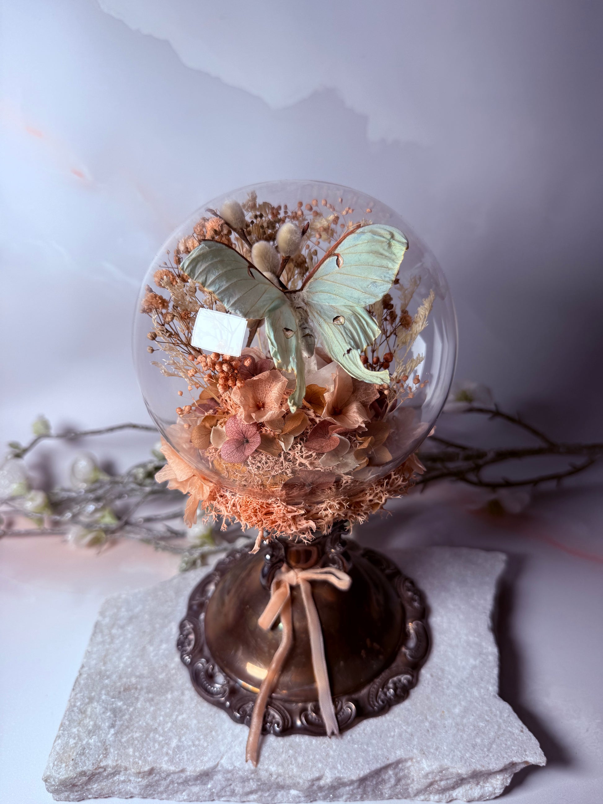 The Actius Luna moth pinned by us mounted in a dome mount with an antique silver candleabra base. It is decorated with real preserved moss, pink velvet ribbon, real quartz crystals and different shades of pink flowers and leaves. No harsh adhesives were used on the candle holder keeping its integritity and making this a timeless investment piece!