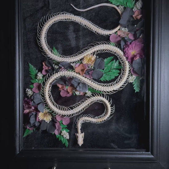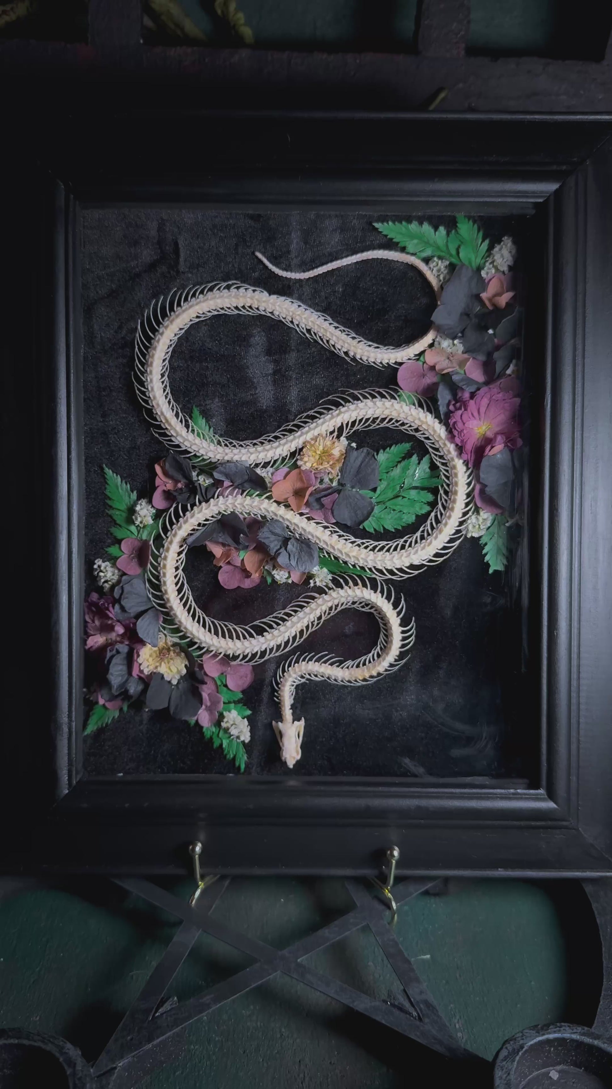 A framed articulated Bungarus Candidus/Malayan kraitskeleton. Mounted in a handmade shadow box frame upcycled from a thrift store that is only designed for wall mounting. The frame backed with black velvet and decorated with real preserved florals and ferns.