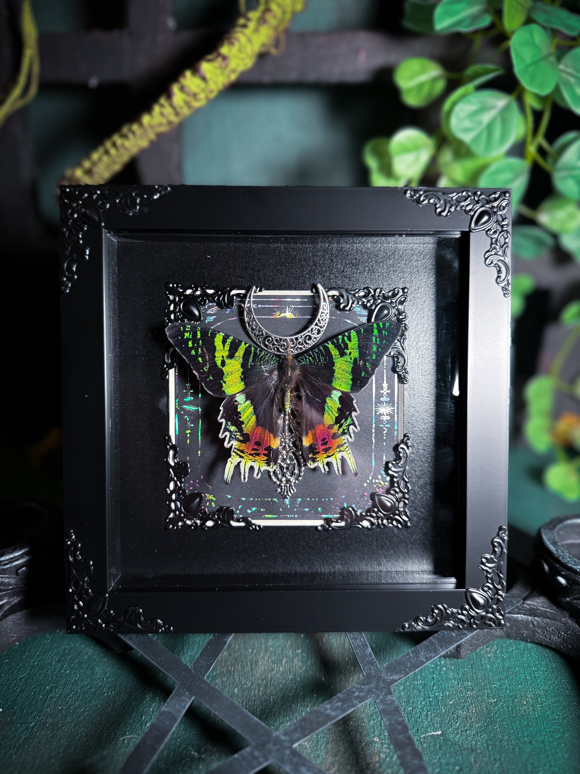 A framed Chrysiridia rhipheus madagascan sunset moth pinned by us. A visually stunning deep brown moth with stunning iridescent rainbow stripes. Mounted in a shadow box frame that can be stood up or displayed on a wall. The frame is decorated with black and silver metal decals, and a holographic silver foil backing.