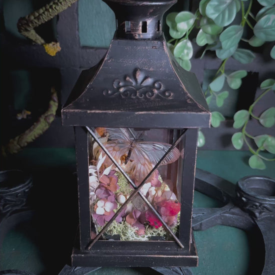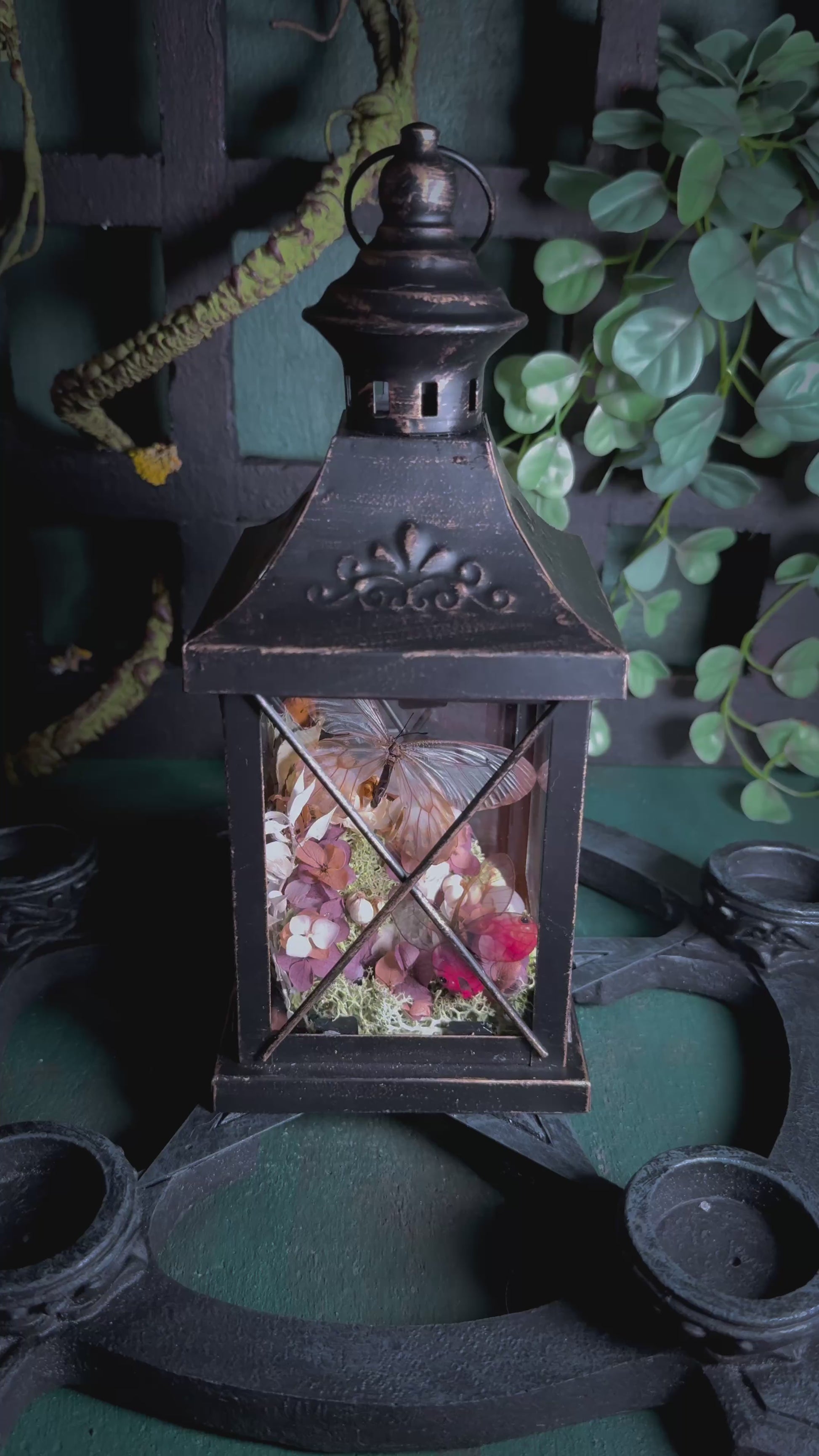 Welcome to our unique and beautiful fae lanterns! This piece features 2 specimens, a female cressidia cressidia butterfly and the cithaerias aurorina. It is internally decorated with real preserved moss and preserved florals creating a stunning natural earthy display. We have internally sealed the lantern without impacting the visual aesthetic of the lantern, so not only is it stunning, but your specimen is safe inside!
