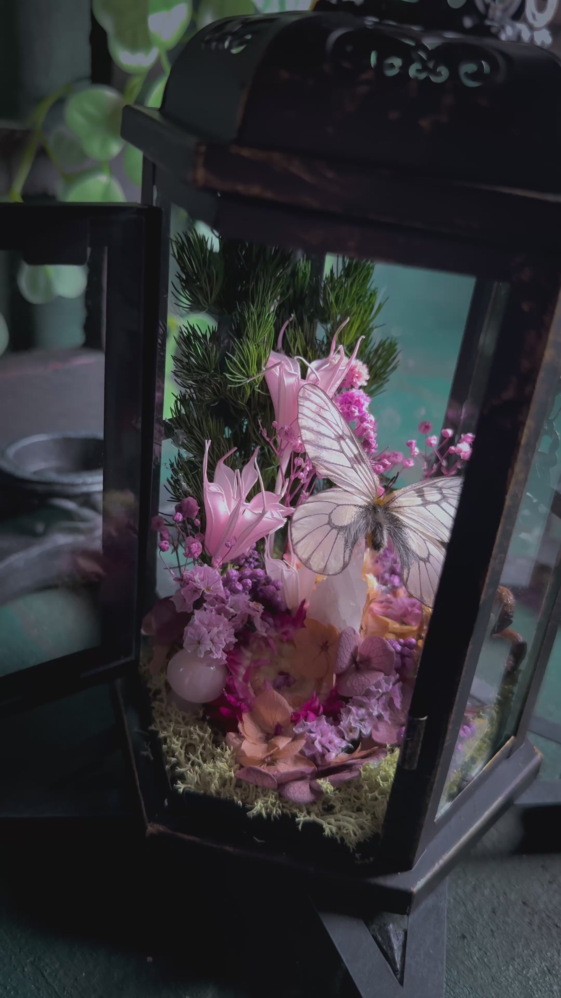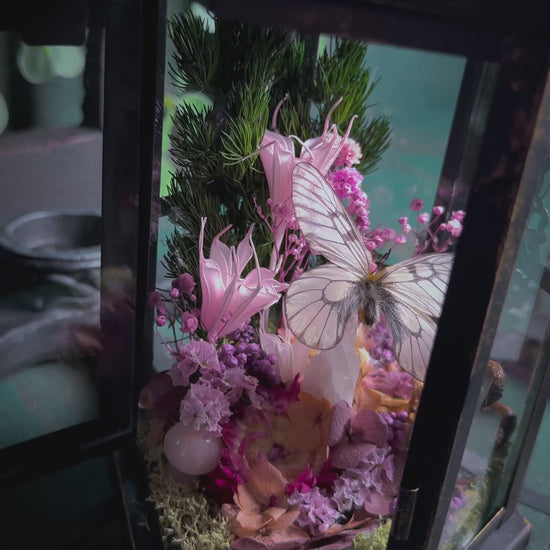 Welcome to our unique and beautiful fae lanterns! This piece features a Parsinus Citrinarus butterfly and a real quartz crystal tower as well as real preserved oyster mushrooms. It is internally decorated with real preserved moss and preserved florals creating a stunning natural earthy display. We have internally sealed the lantern without impacting the visual aesthetic of the lantern, so not only is it stunning, but your specimen is safe inside!