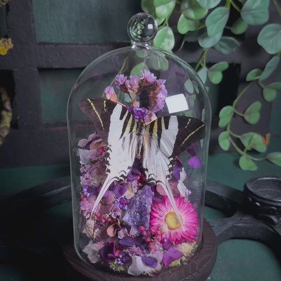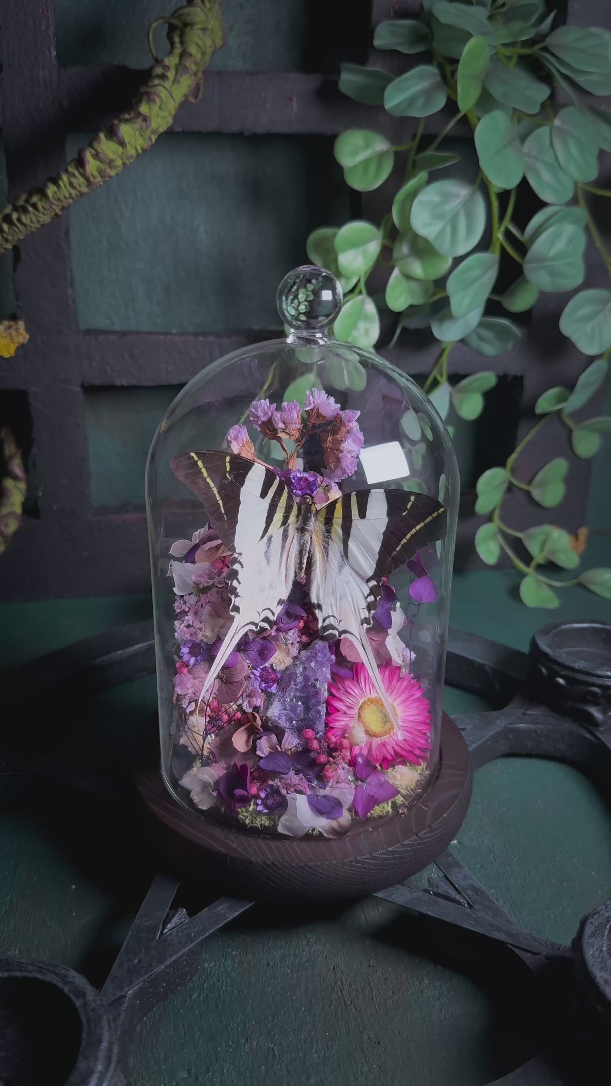 The Graphium Androncles butterfly pinned by us and mounted in a dome mount. The dome comes with a wooden base and domed glass topper. It is decorated with real preserved moss, as well as different shades of pink, white and purple flowers, and leaves. It also contains a small but real amethyst crystal cluster!