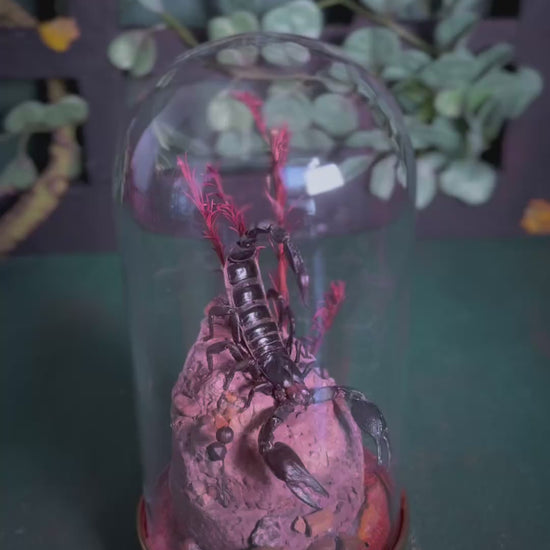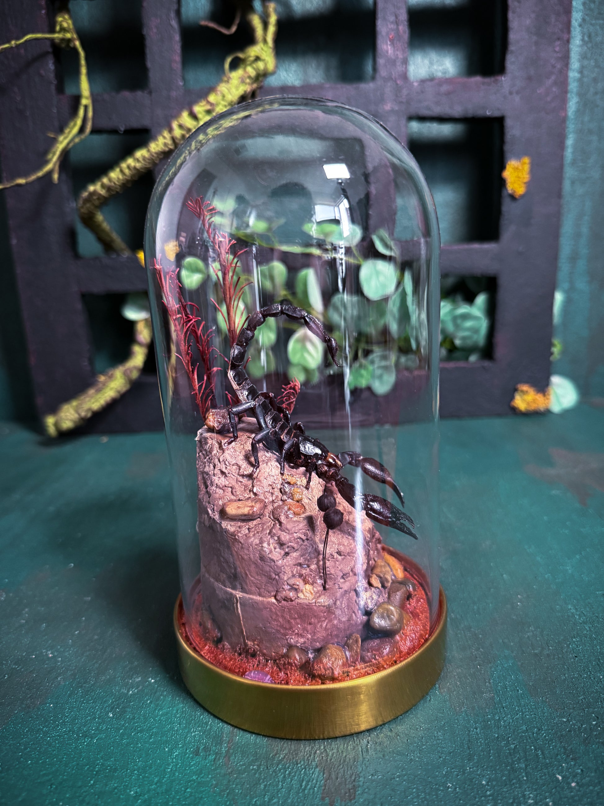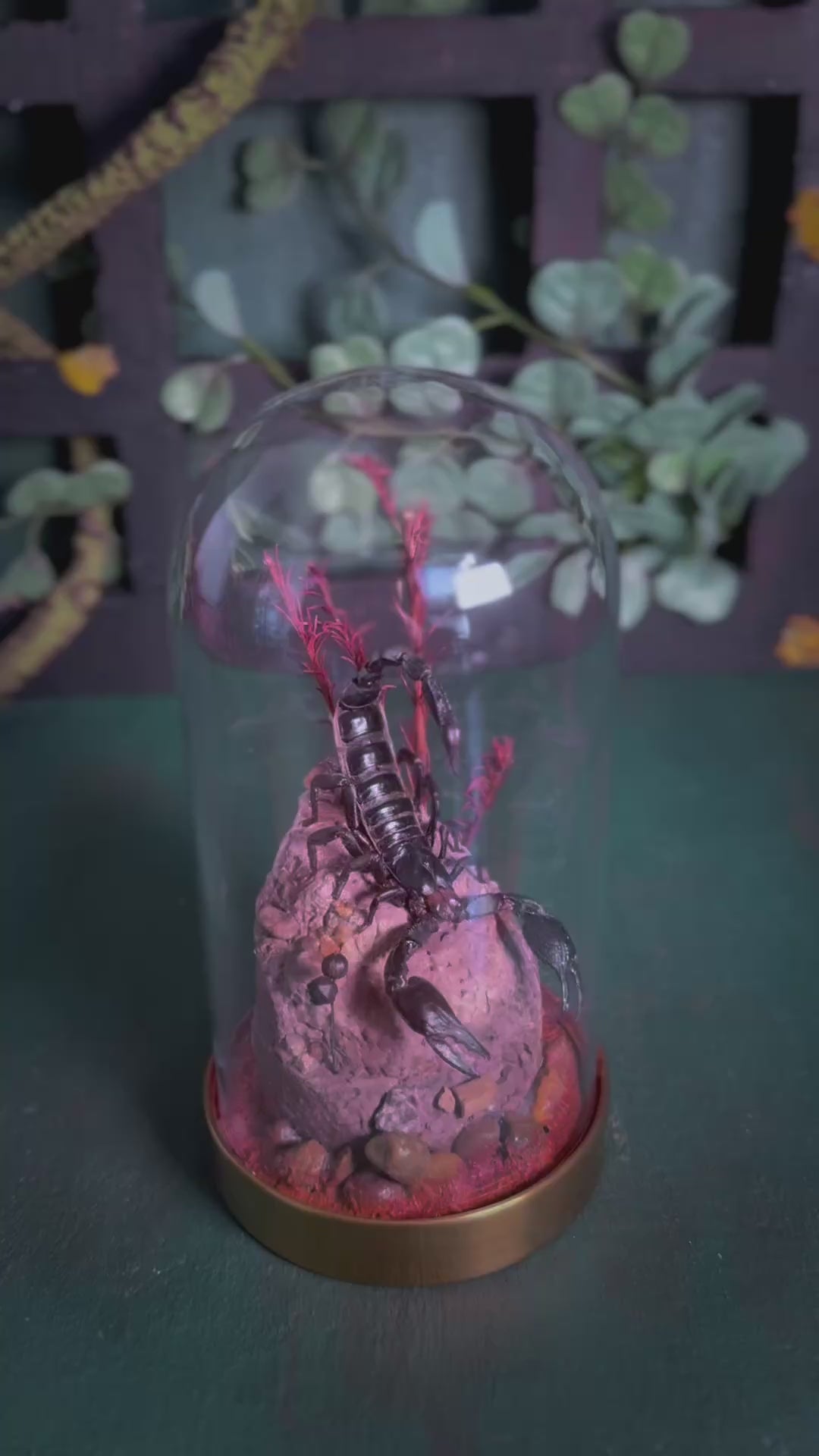 A mounted Heterometrus Laoticus/Vietnam forest scorpion pinned by us. Mounted in a tall dome with a metal gold base, internally decorated preserved florals, red sand and rocks creating a stunning natural earthy display that contrasts the moth and gives a full 360 display.