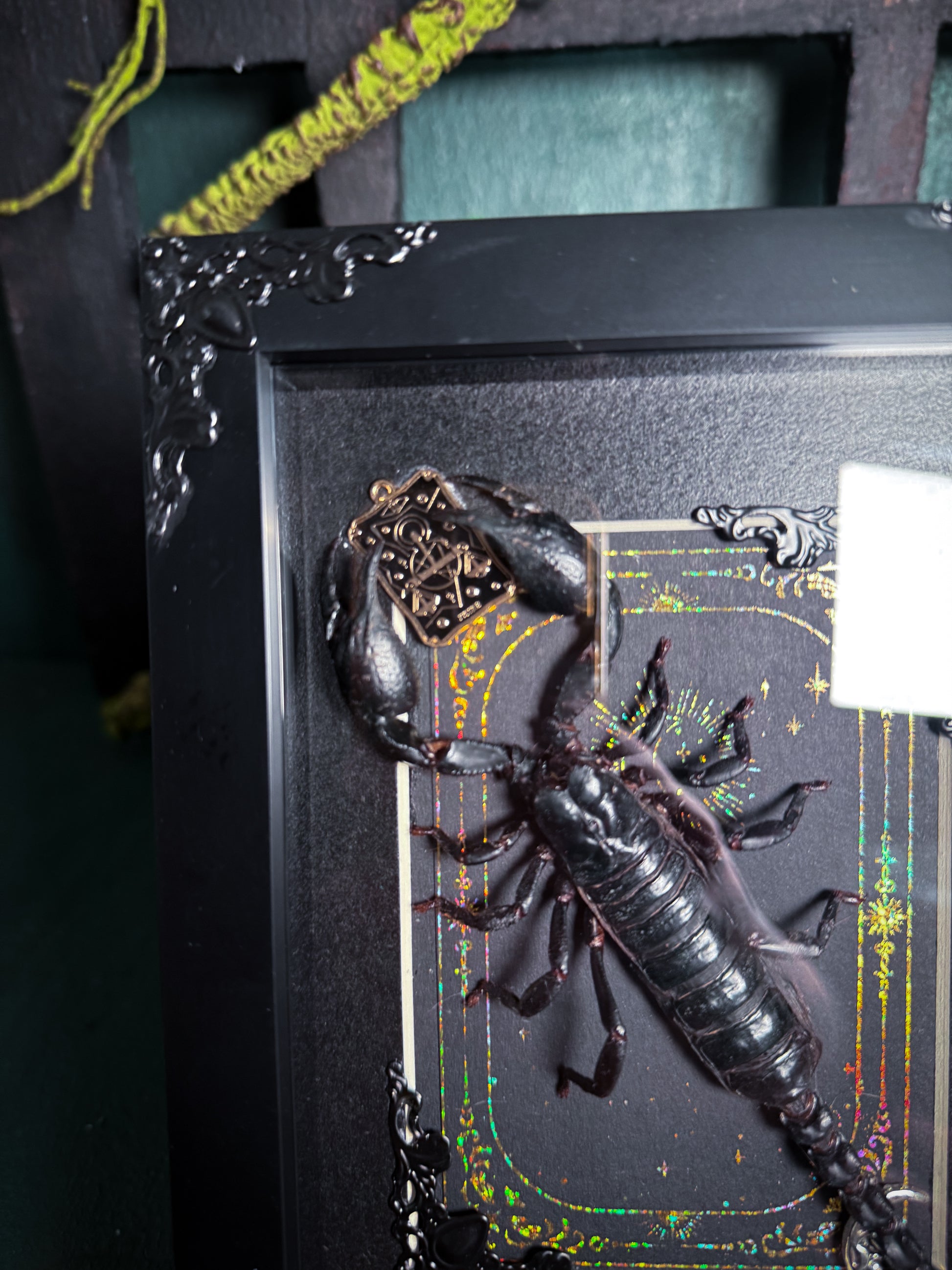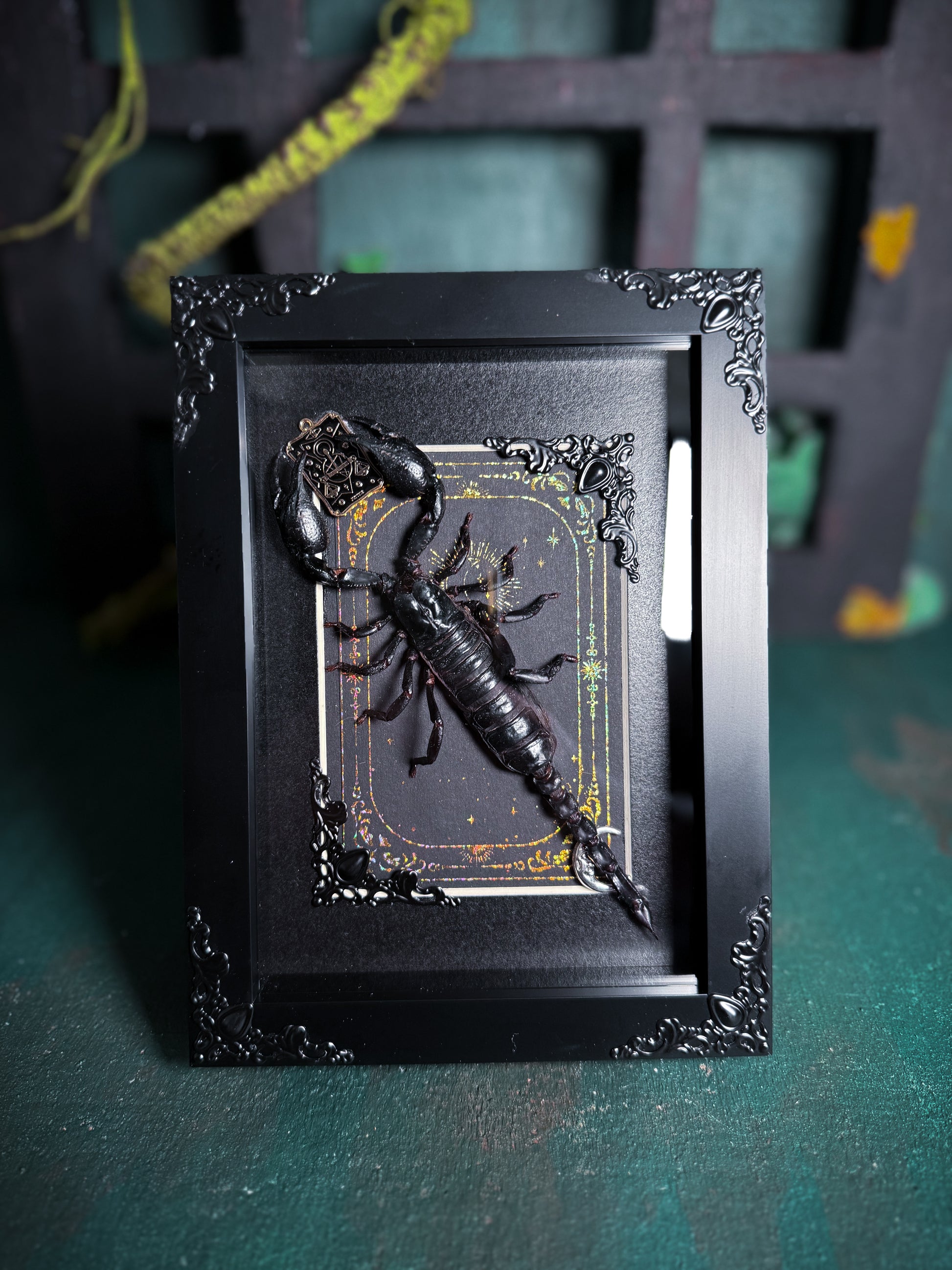 A framed Heterometrus Laoticus/Vietnam forest scorpion pinned by us. Mounted in a shadow box frame that can be stood up or displayed on a wall. The frame is decorated with black metal decals, justice tarot charm as well as a silver moon tarot charm and gold holographic foil backing. A charming and remarkably long scorpion with large pincers, such an aesthically beautiful specimen.