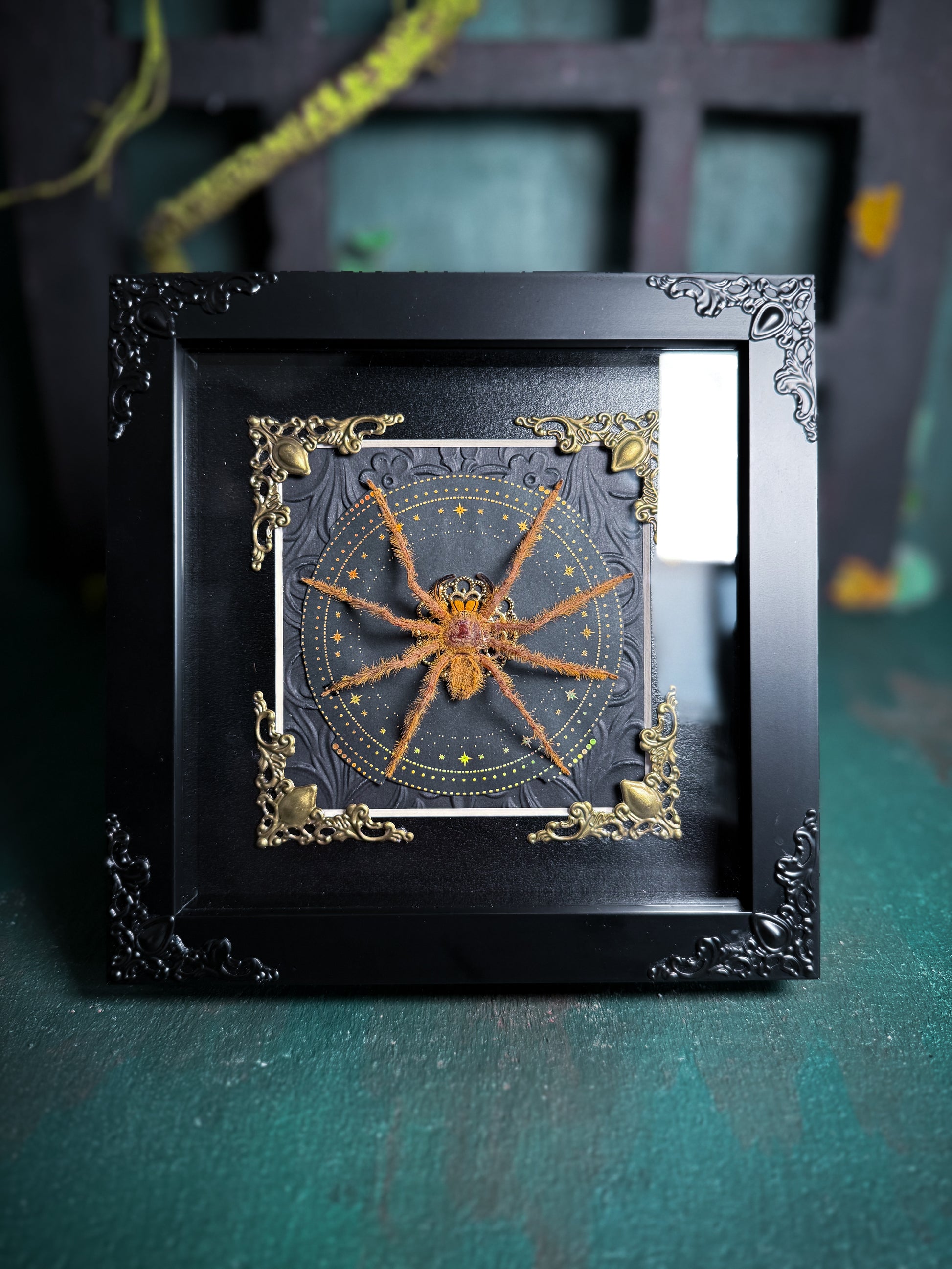 A framed Heteropoda Sp/ Huntsman Spider pinned by us. Mounted in a shadow box frame that can be stood up or displayed on a wall. The frame is decorated with gold metal decals and embossed and gold foil backing. A stunning fluffy orange spider who could even turn those afraid into lovers!