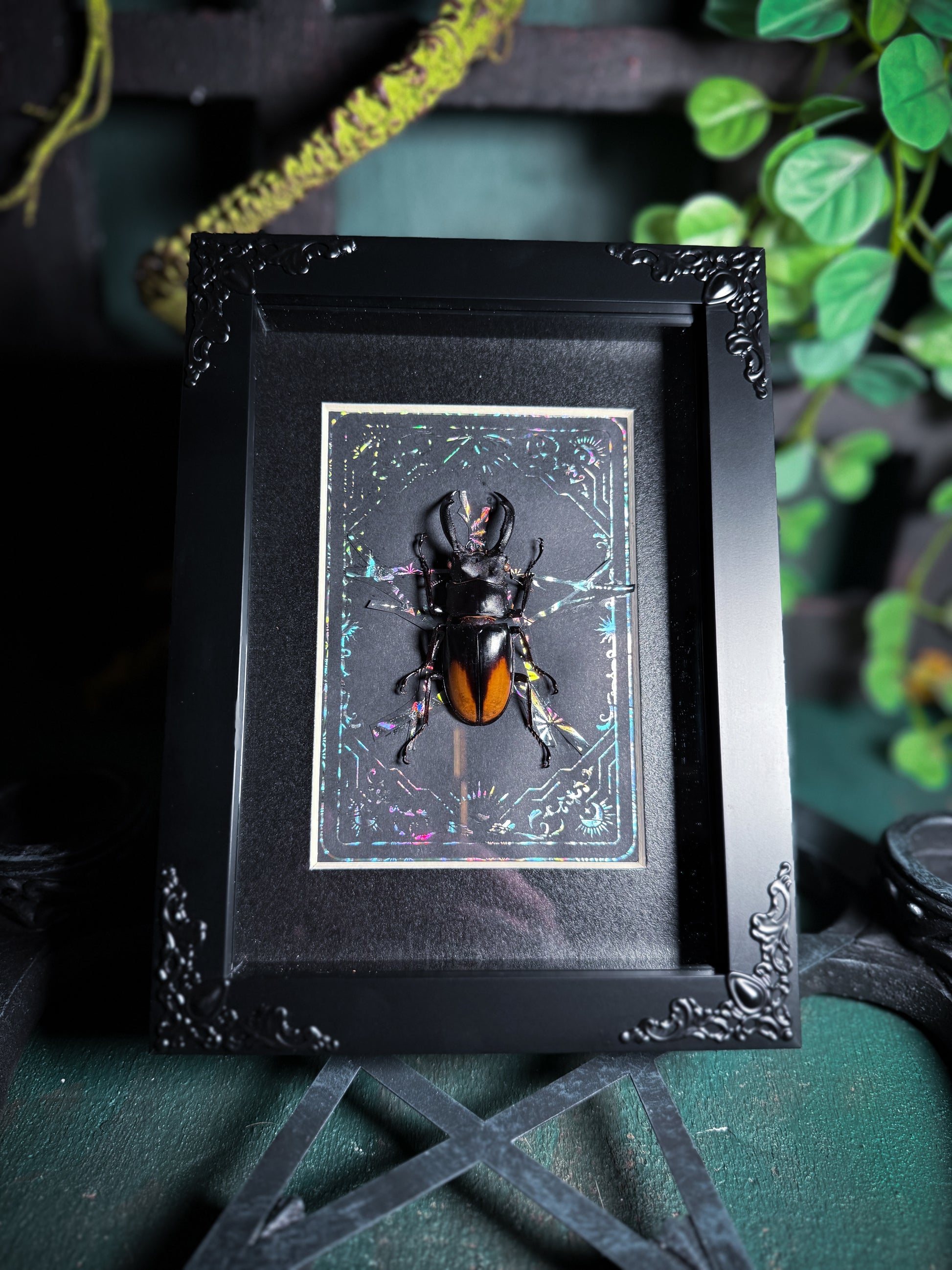 A framed Hexarthrius Parryi Paradoxis beetle pinned by us. Mounted in a shadow box frame that can be stood up or displayed on a wall. The frame is decorated with a holographic silver foil pentagram and ornate frame backing.
