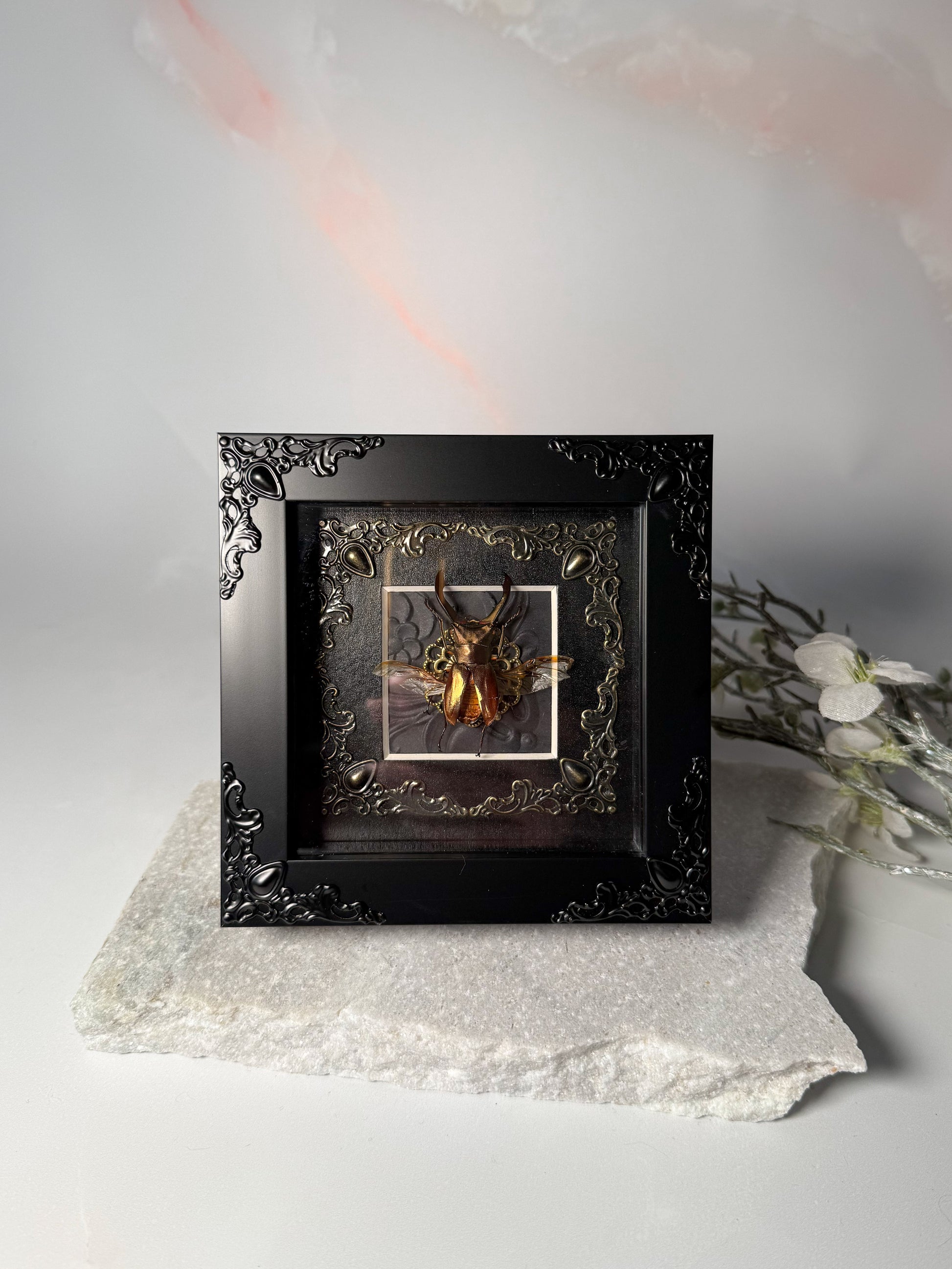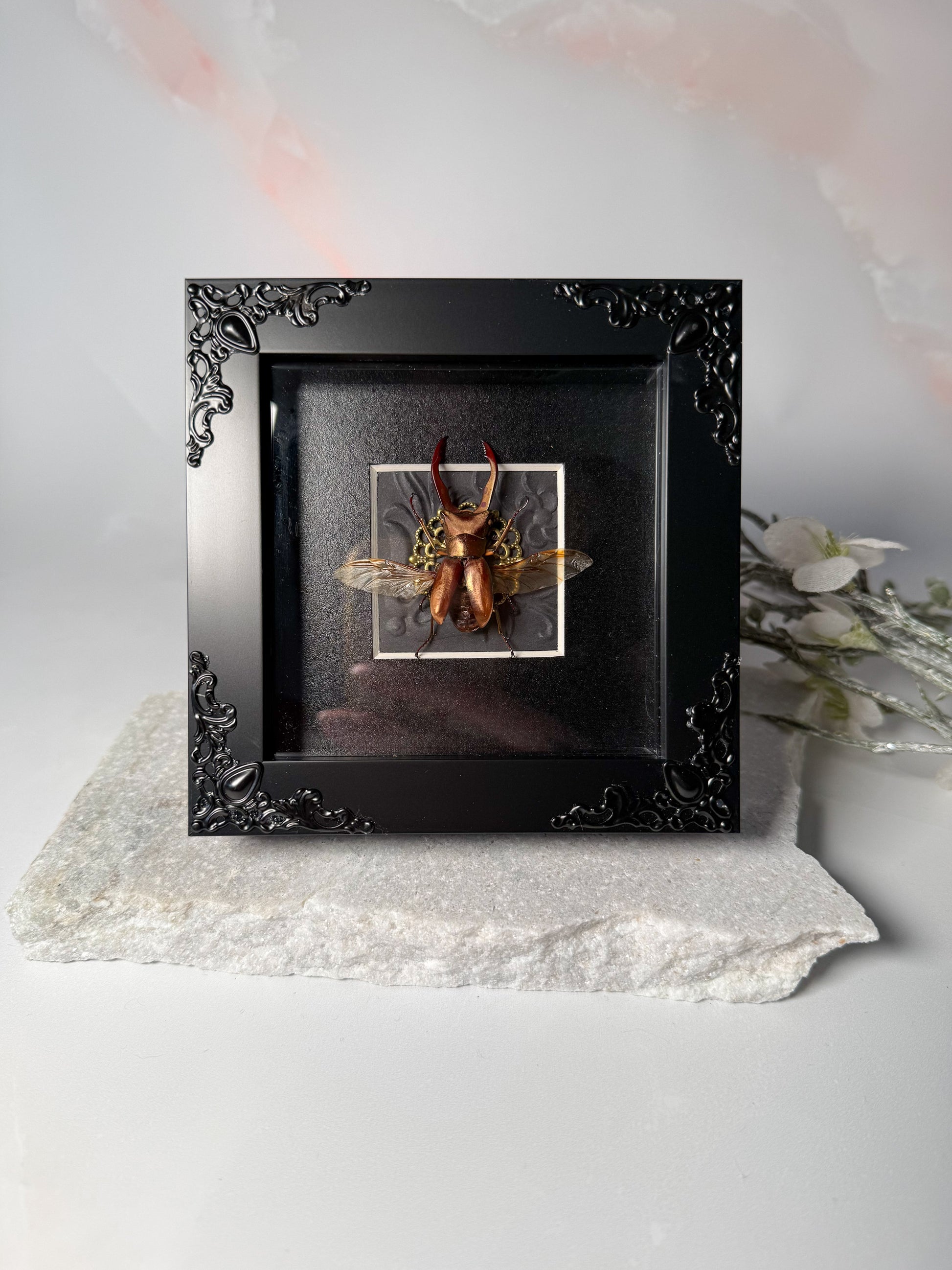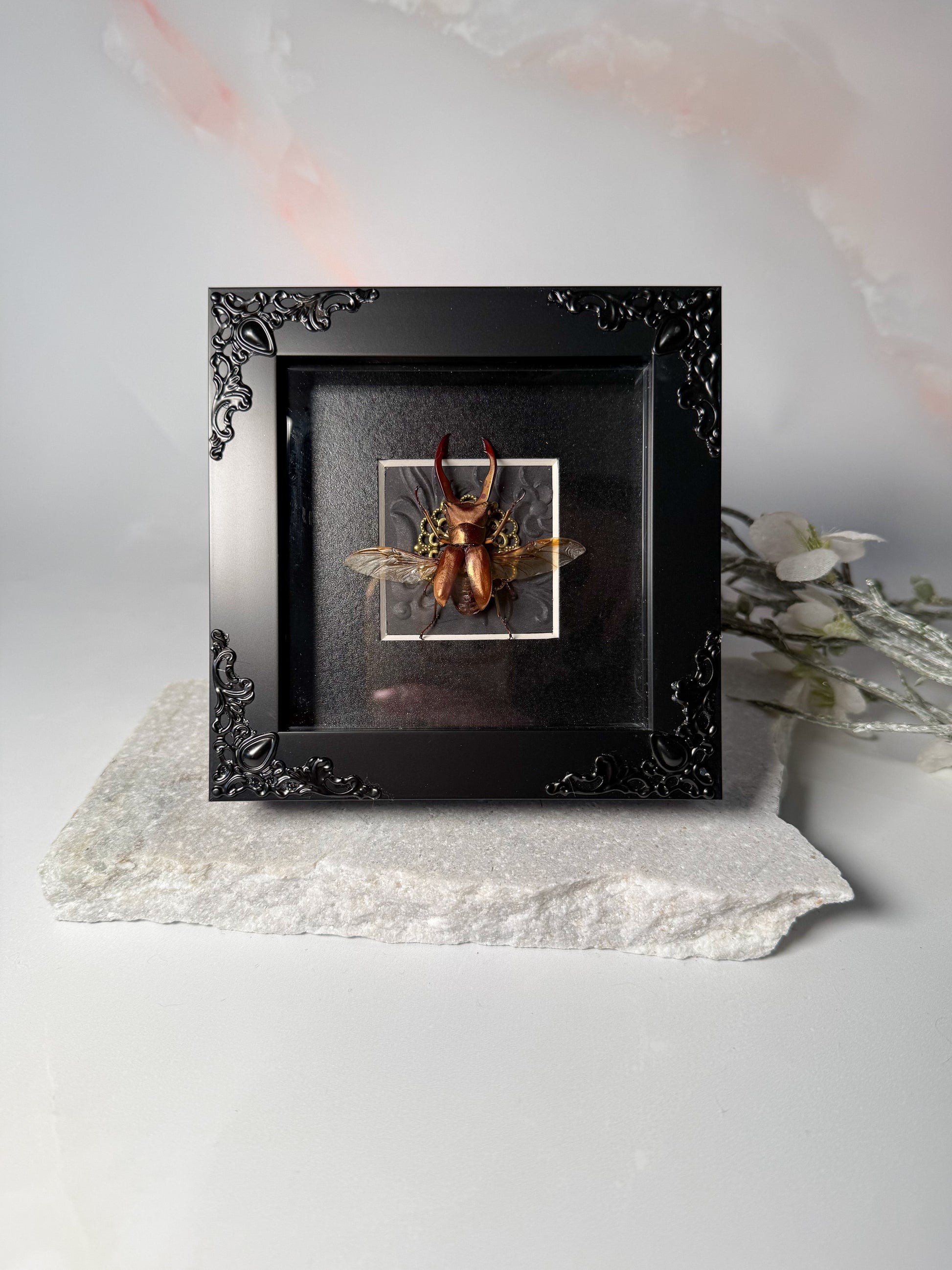 A framed Cyclommatus Metallifer Beetle pinned by us. The name reflects the appearance as the C.metallifer genuinely looks as if it was plated in metal. Mounted in a shadow box frame that can be stood up or displayed on a wall.