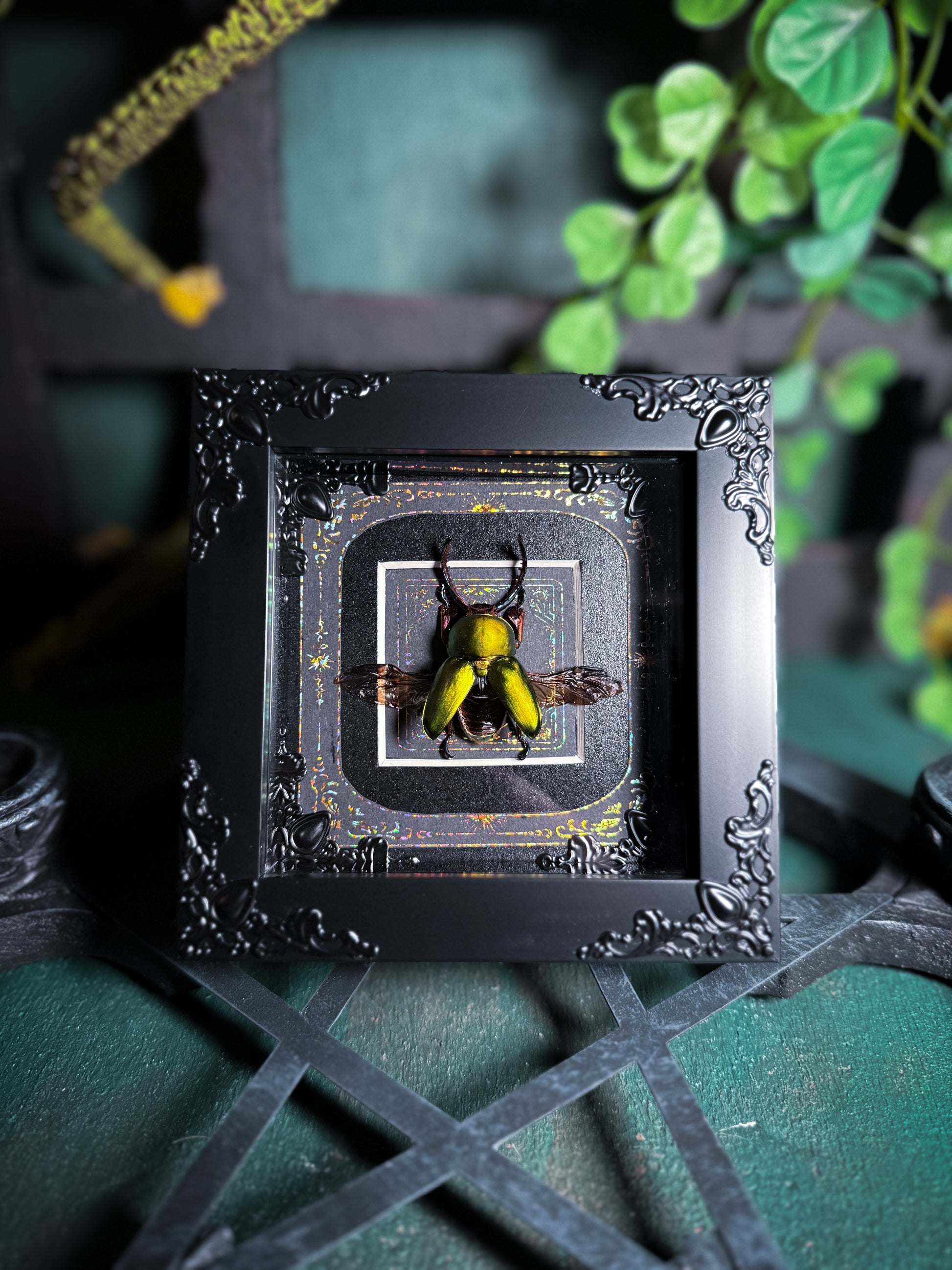 A framed Lamprima Adolphinae Beetle pinned by us. A beautiful golden green male stag beetle with long, curved, saw like mandibles. Mounted in a shadow box frame that can be stood up or displayed on a wall. The frame is decorated with gold foiling.