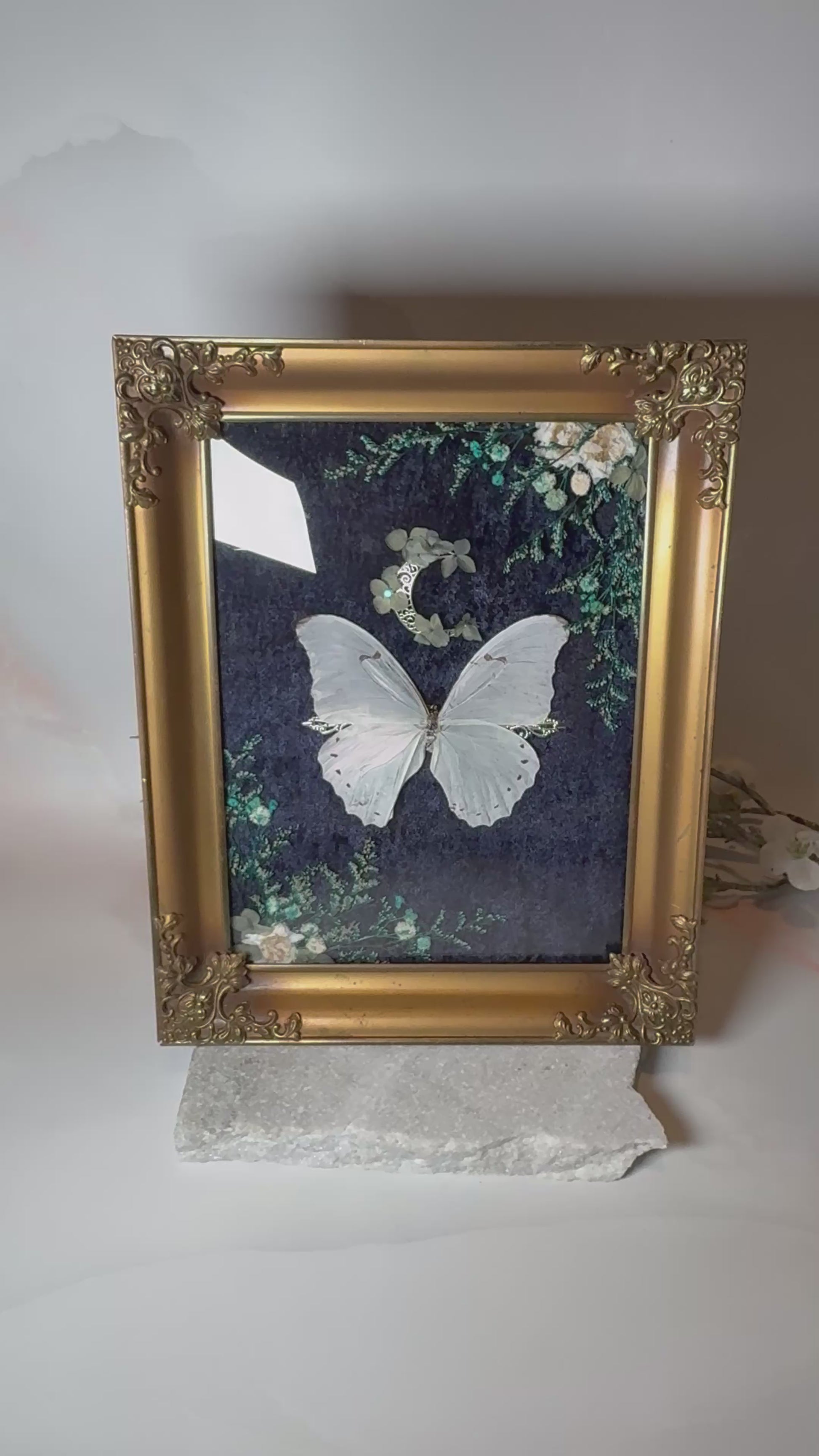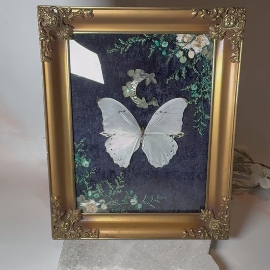 A framed Morpho Polyphemus butterfly pinned by us. Mounted in a rare antique brass convex glass frame made in italy that is to be displayed on a wall. The frame is backed with dark blue velvet and decorated with white & blue flowers and leaves and a silver moon decal.