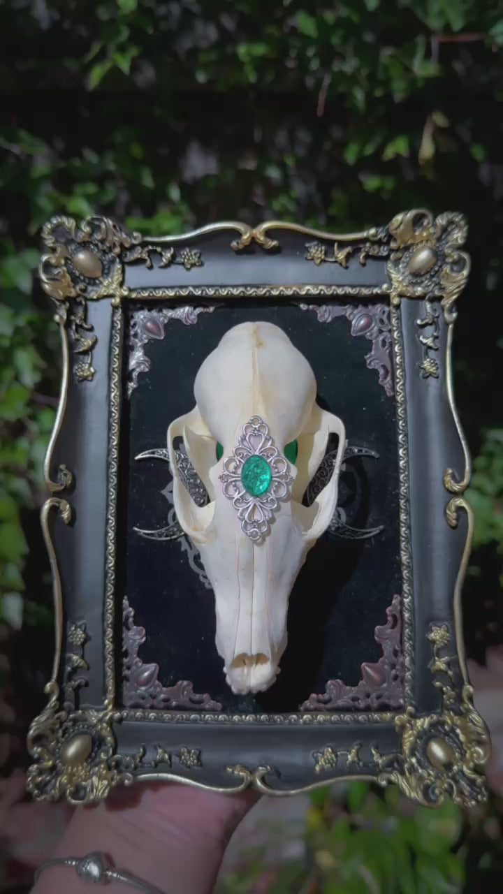 One of a kind real fox skull mounted on a dual tone green velvet backed ornate frame and decorated with metal decals and a large green rhinestone behind the eyes that adds a pop of green sparkle depending on the angle. The frame is versatile and can be stood up on a desk or hung on a wall.