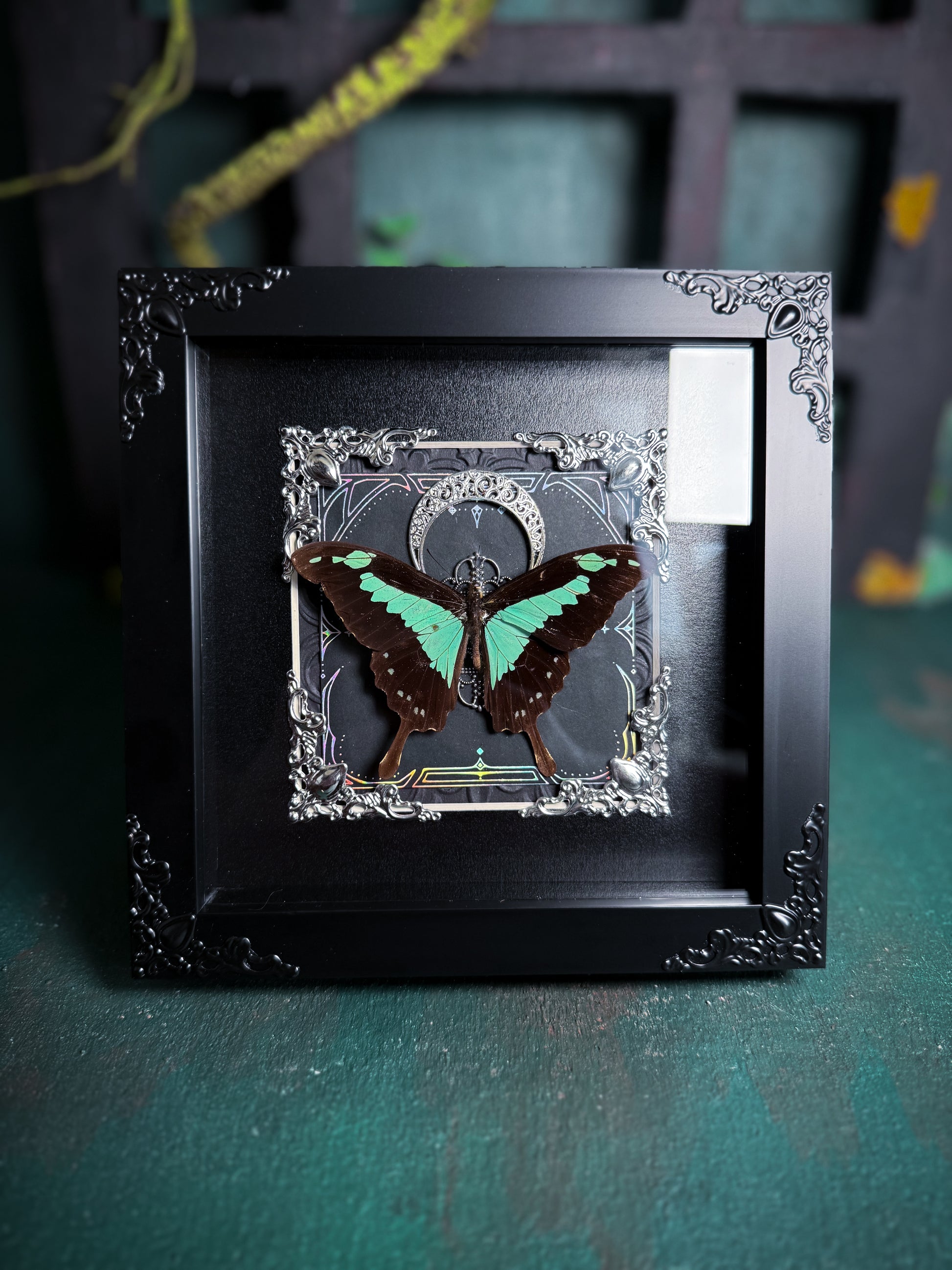A framed Papilio Phorcas/the apple-green swallowtail butterfly pinned by us. Mounted in a shadow box frame that can be stood up or displayed on a wall. The frame is decorated with silver metal decals, embossed and holographic foil backing. The minty green hues of the centre are unique to find in any moth or butterfly.