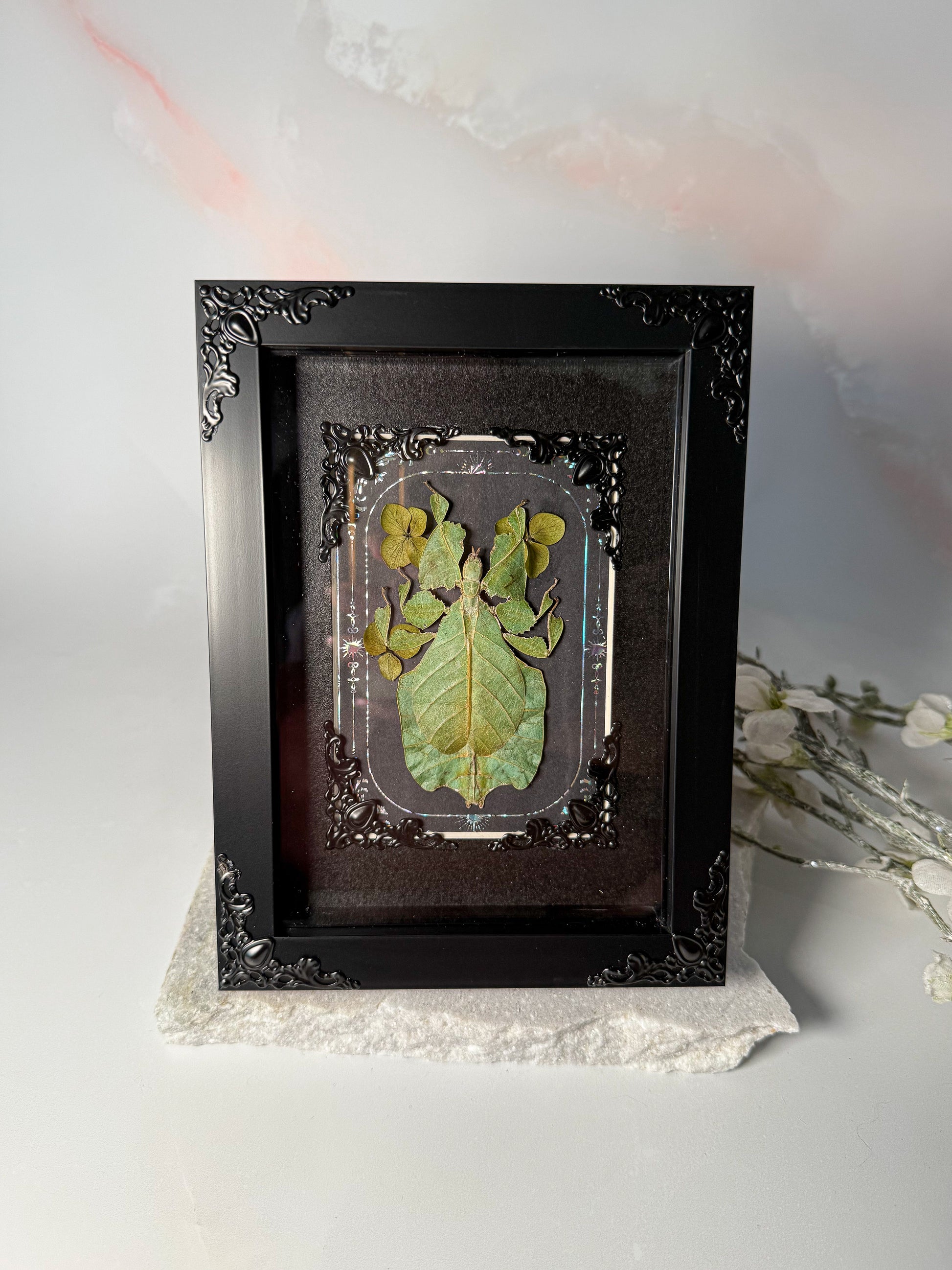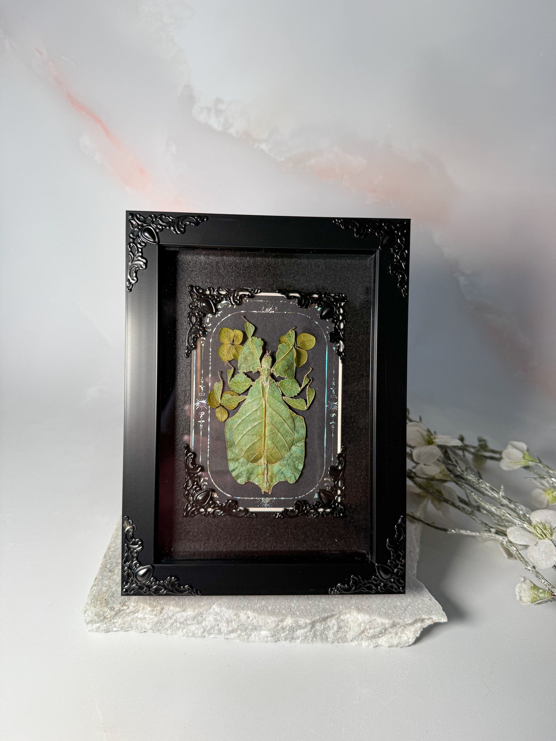 A framed Phyllium Bioculatum/Gray's leaf insect pinned by us. Mounted in a shadow box frame that can be stood up or displayed on a wall. The frame is decorated with a holographic silver foil frame, black metal decals and green hydrangea flowers.