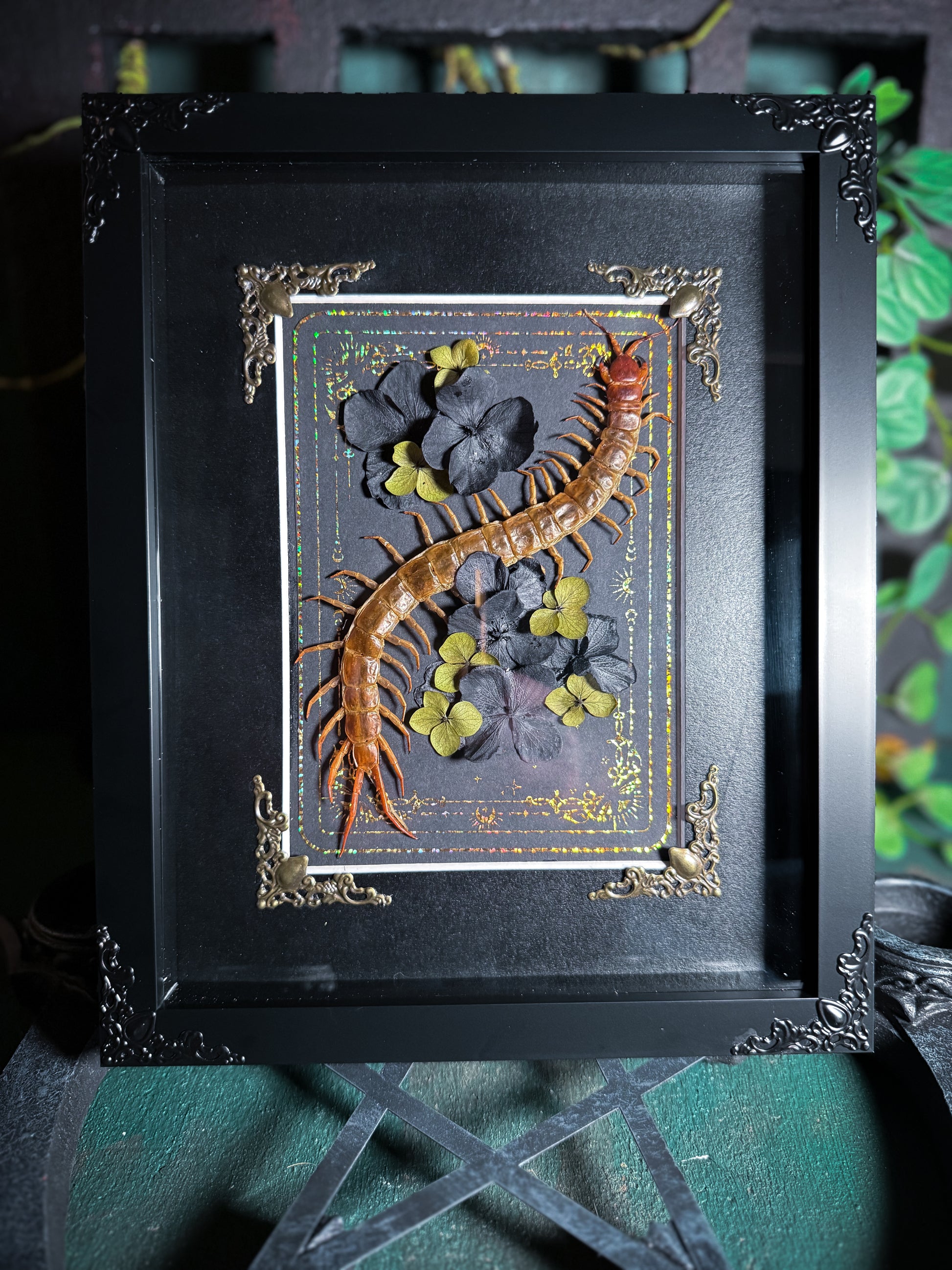 A framed Scolopenda Subspinipes Centerpede pinned by us. It is a species of very large centipede found throughout southeastern Asia. One of the most widespread and common species. Mounted in a shadow box frame that can be stood up or displayed on a wall. The frame is decorated with a gold holographic foil backing, gold metal decals and black and green real preserved hydrangea flowers.