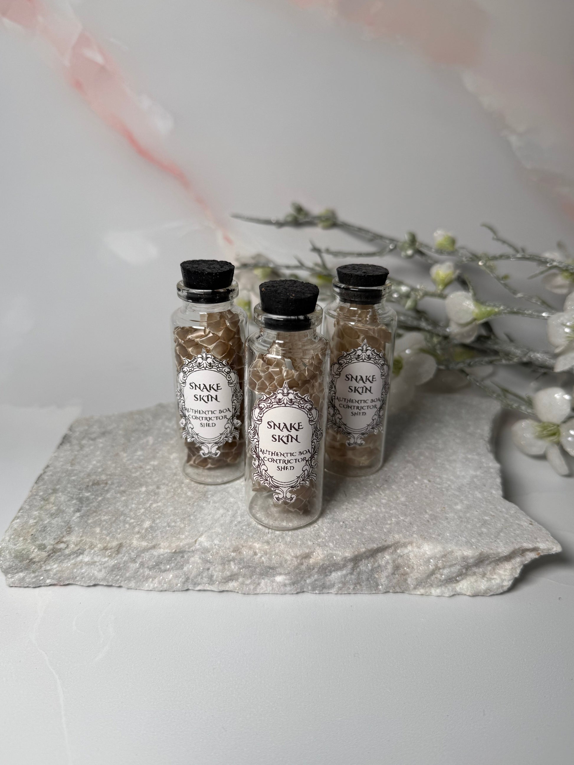 A cute small glass jar with black cork top. Each jar contains skin naturally shed from a boa constrictor snake, jars are selected at random with your order but are made to be as equal as possible.
