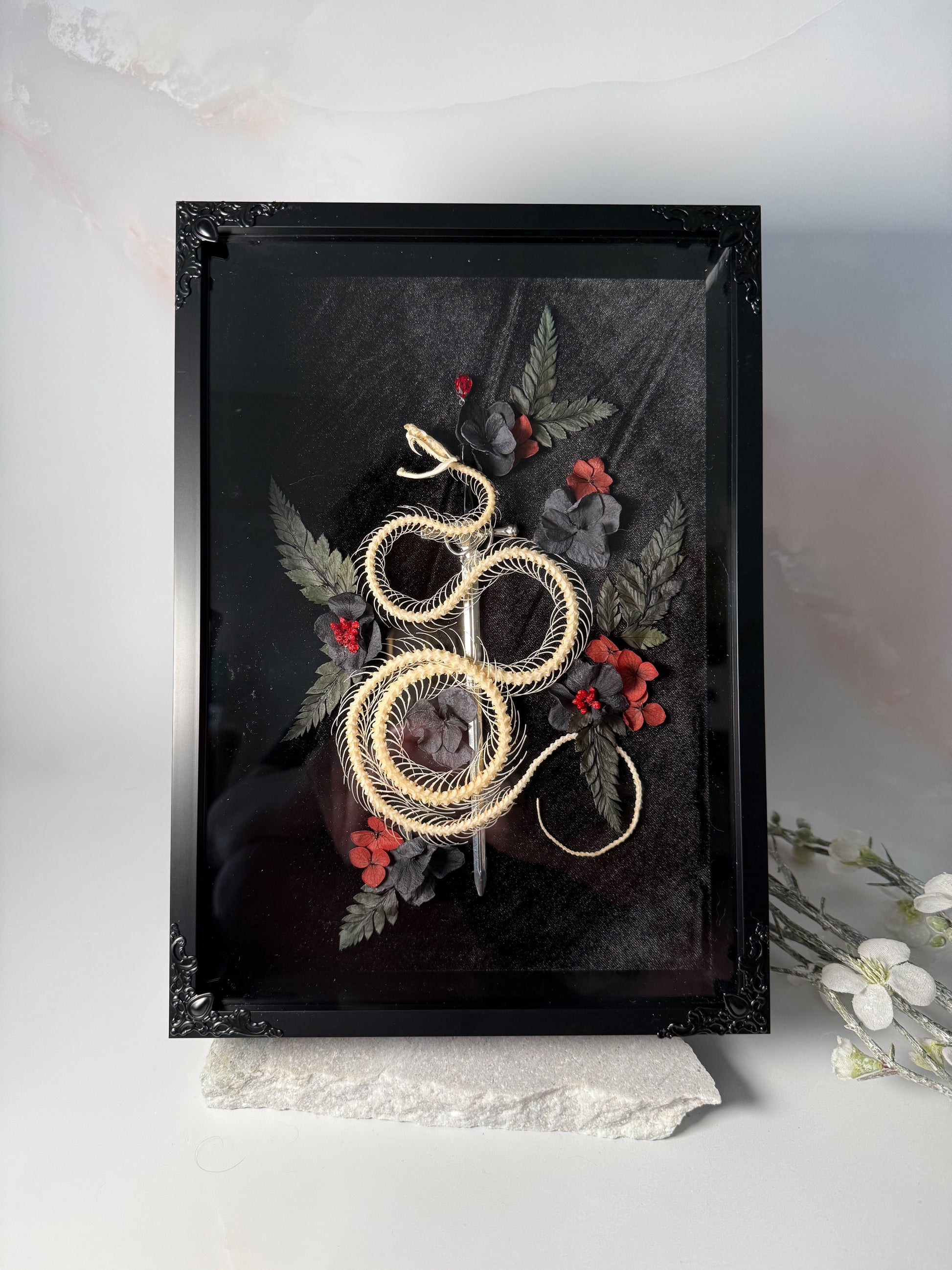A framed articulated Trimeresurus Albolaboris skeleton. The frame backed with black velvet and decorated with real preserved florals in black and red with a sword running down the centre.
