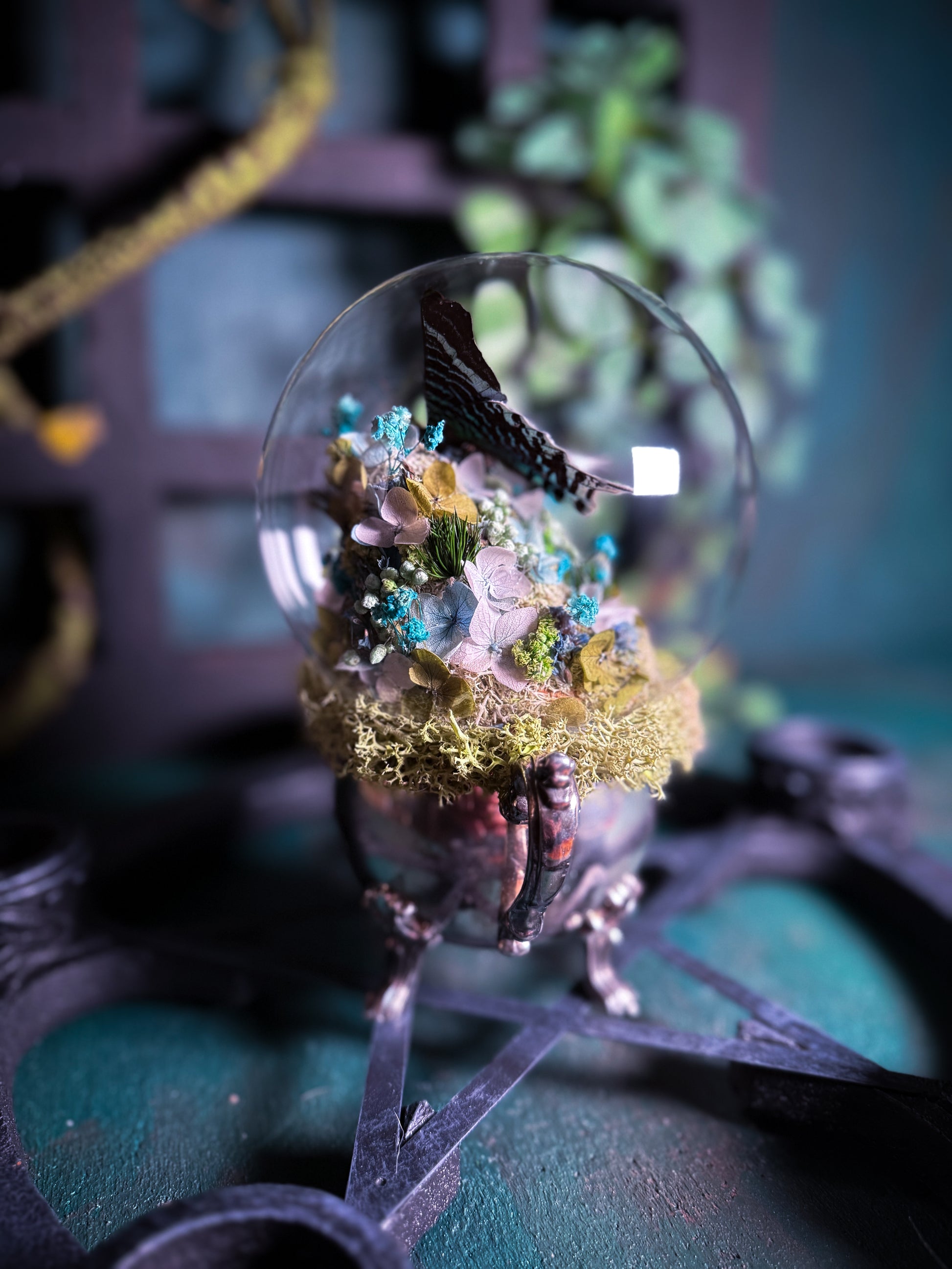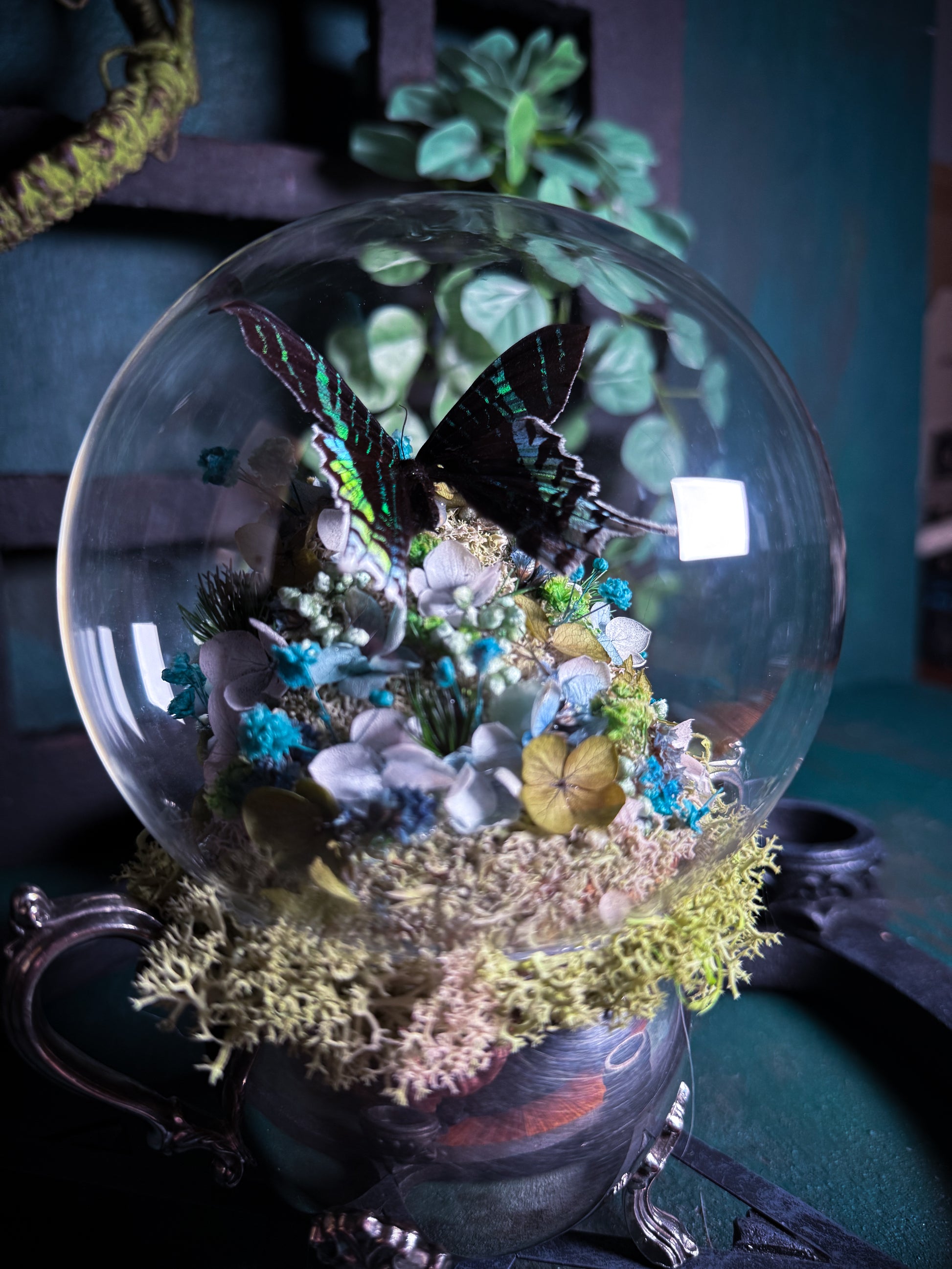 A mounted Urania Leilus moth pinned by us. Mounted in a round dome with a thrifted antique silver sugar jar base that has stunning intricate handle designs and 4 claw feet. Internally decorated with real preserved moss and preserved florals creating a stunning natural earthy display that contrasts the moth and gives a full 360 display. This is a true investment piece, with proper care of it being taken. It truely can't be completely recreated making it one of a kind!